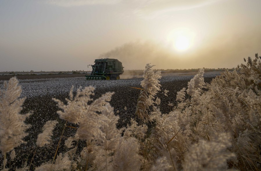 A cotton picker works in one of farmer Erkin Rehim's fields in Yuli County, northwest China's Xinjiang Uygur Autonomous Region, Oct. 24, 2021. (Xinhua/Zhao Ge)