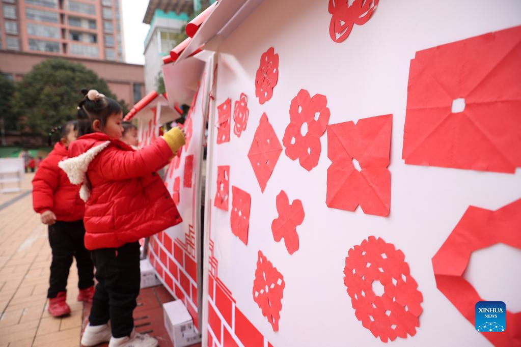 Children show their paper cutting works at a kindergarten in Danzhai County, southwest China's Guizhou Province, Dec. 31, 2021. People across China organize various kinds of activities to greet the upcoming New Year. (Photo by Huang Xiaohai/Xinhua)
