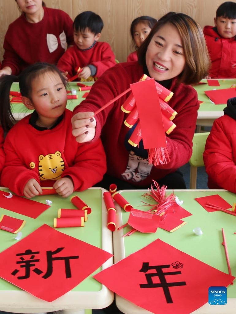 Children learn to make New Year decorations with their teacher at a kindergarten in Linyi, east China's Shandong Province, Dec. 31, 2021. People across China organize various kinds of activities to greet the upcoming New Year. (Photo by Zhang Chunlei/Xinhua)