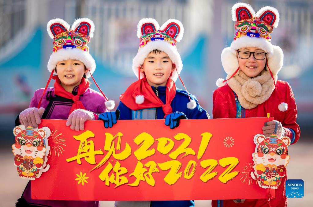 Students hold red lanterns to celebrate the New Year at an elementary school in Zaozhuang, east China's Shandong Province, Dec. 31, 2021. People across China organize various kinds of activities to greet the upcoming New Year. (Photo by Sun Zhongzhe/Xinhua)
