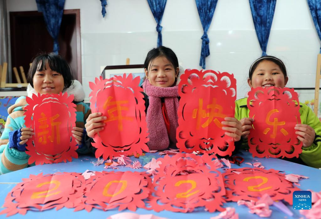 Students show their paper cutting works at an elementary school in Qianxi, southwest China's Guizhou Province, Dec. 31, 2021. People across China organize various kinds of activities to greet the upcoming New Year. (Photo by Zhai Peisheng/Xinhua)