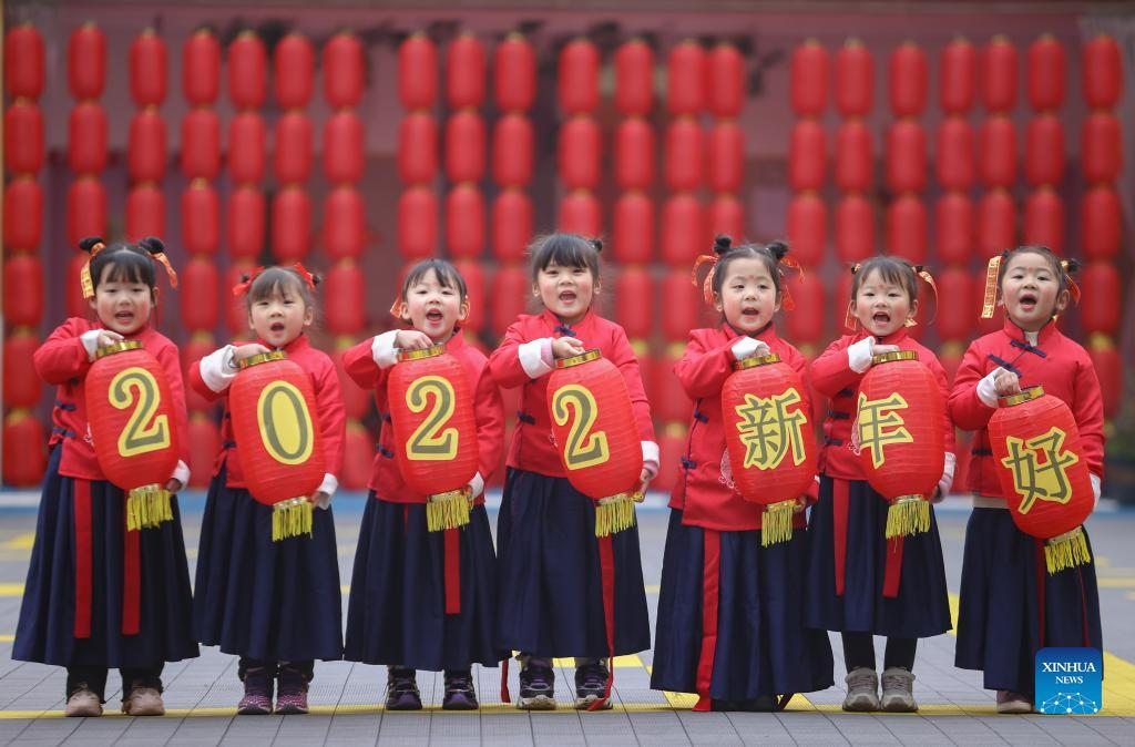 Children hold red lanterns during a New Year celebration at a kindergarten in Suining, southwest China's Sichuan Province, Dec. 31, 2021. People across China organize various kinds of activities to greet the upcoming New Year. (Photo by Liu Changsong/Xinhua)