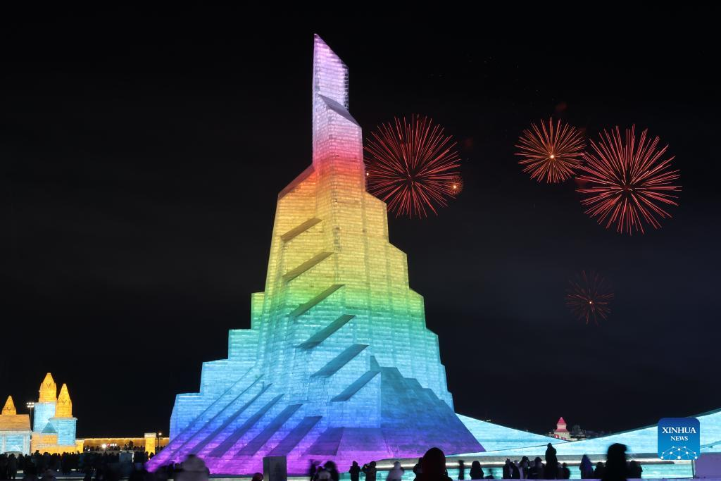 Photo taken on Dec. 31, 2021 shows a firework show to celebrate the New Year at the Harbin Ice-Snow World in Harbin, northeast China's Heilongjiang Province. (Xinhua/Zhang Tao)