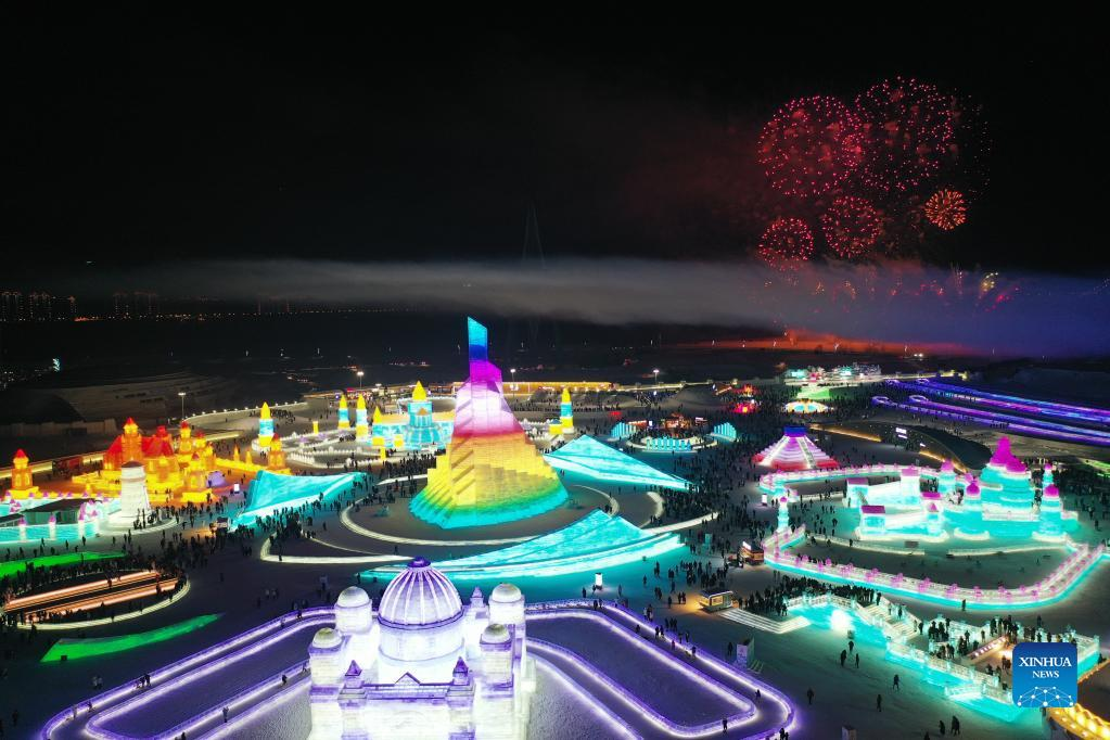 Aerial photo taken on Dec. 31, 2021 shows a firework show to celebrate the New Year at the Harbin Ice-Snow World in Harbin, northeast China's Heilongjiang Province. (Xinhua/Xie Jianfei)