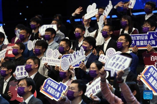 Photo taken on Jan. 1, 2022 shows college students participating in a space-Earth video talk with the Chinese astronauts on board space station Tiangong in Beijing, capital of China. (Xinhua/Jin Liangkuai)