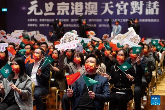 Photo taken on Jan. 1, 2022 shows college students participating in a space-Earth video talk with the Chinese astronauts on board space station Tiangong in south China's Macao. (Xinhua/Cheong Kam Ka)