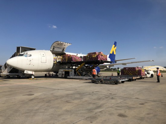 Staff members unload cargos from a plane at the Phnom Penh International Airport in Phnom Penh, Cambodia, Dec. 31, 2021. (Photo by Van Pov/Xinhua)