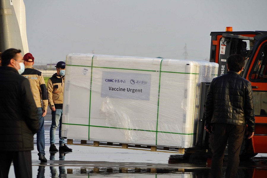 The first batch of Chinese COVID-19 vaccines arrives at Tashkent International Airport in Tashkent, Uzbekistan, on March 27, 2021. (Photo by Zafar Khalilov/Xinhua)