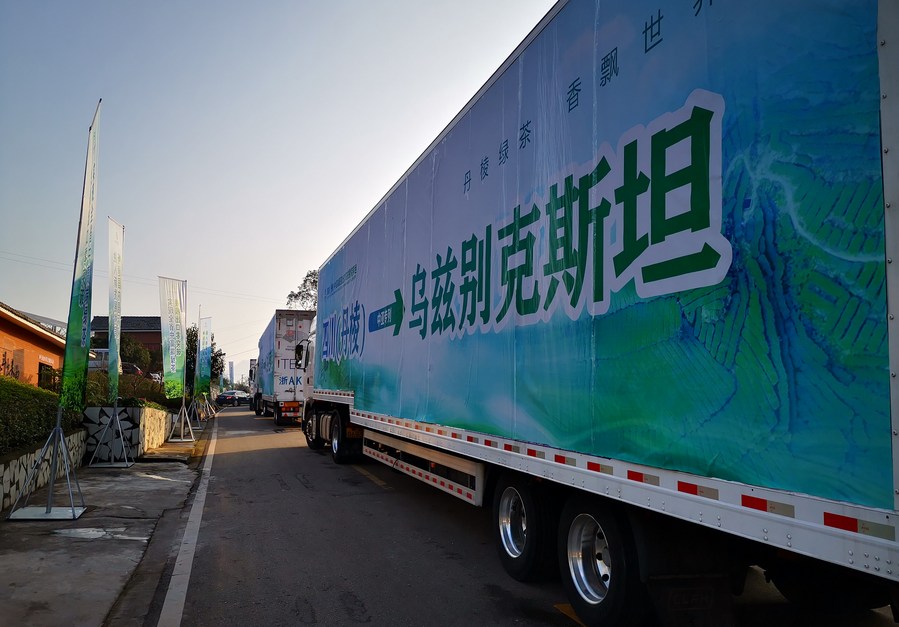 Green tea are loaded to export for Uzbekistan at Danling County, southwest China's Sichuan Province, Dec. 29, 2021. (Xinhua/Chen Jian)