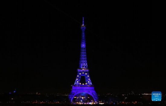 The Eiffel Tower is lit up in blue to celebrate the start of the French presidency of the European Union in Paris, France, Jan. 1, 2022. The most emblematic landmarks in France turned blue Saturday night to mark French presidency of the EU. (Xinhua/Gao Jing)