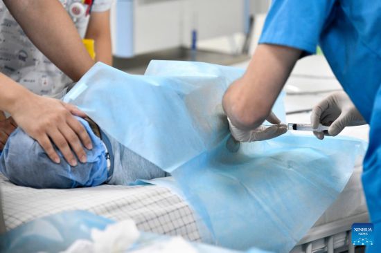 A medical worker injects Spinraza to a 4-year-old child diagnosed with spinal muscular atrophy (SMA) at a hospital in Zaozhuang, east China's Shandong Province, Jan. 1, 2022. China is striving to improve the diagnosis and treatment of rare diseases.