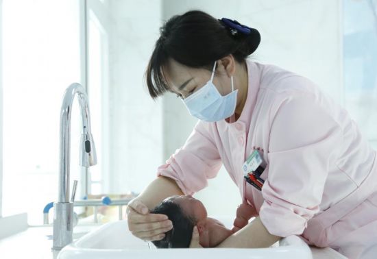 A nurse bathes a new-born at a hospital in Xingtai, north China's Hebei Province, Jan. 1, 2022. (Photo by Zhang Chi/Xinhua)