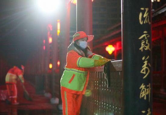 Sanitation workers work in Yuping Dong Autonomous County of Tongren City, southwest China's Guizhou Province, Jan. 1, 2022. (Photo by Hu Panxue/Xinhua)