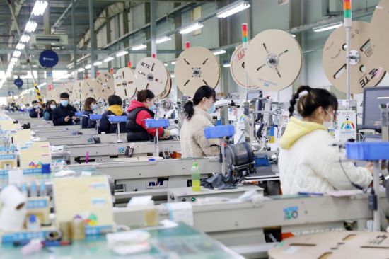 Workers work on an assembly line of electronic products at a company in Huaibei, east China's Anhui Province, Jan. 1, 2022. (Photo by Wan Shanchao/Xinhua)