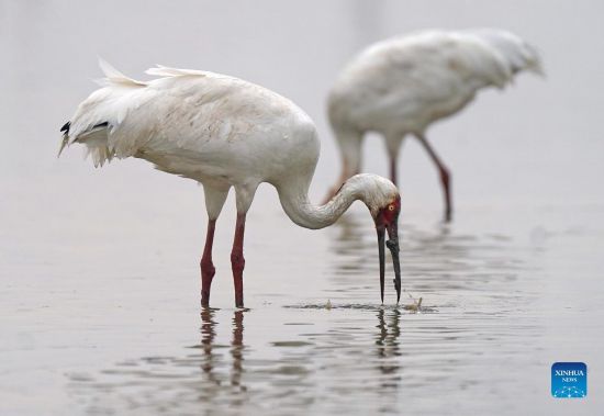 White cranes forage at a white crane conservation area by the Poyang Lake in Nanchang, east China's Jiangxi Province, Jan. 1, 2022. (Xinhua/Wan Xiang)