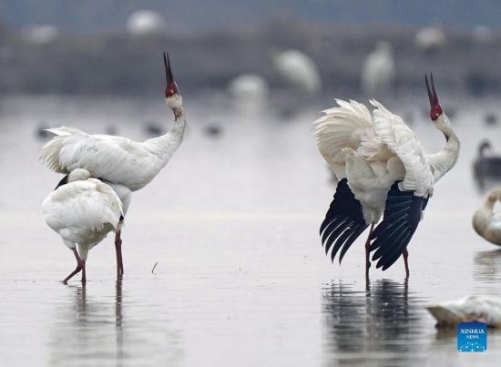 White cranes rest at a white crane conservation area by the Poyang Lake in Nanchang, east China's Jiangxi Province, Jan. 1, 2022. (Xinhua/Wan Xiang)