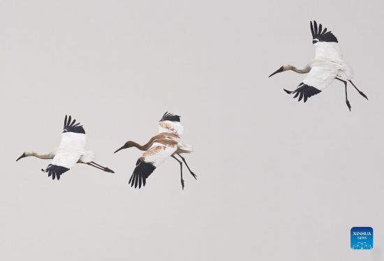 White cranes fly over a white crane conservation area by the Poyang Lake in Nanchang, east China's Jiangxi Province, Jan. 1, 2022. (Xinhua/Wan Xiang)