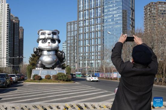 A resident takes photos of a giant panda art installation in the Wangjing subdistrict of Chaoyang District in Beijing, capital of China, Jan. 2, 2022. The brand-new stainless steel art installation, which is 10.5 meters in height, was unveiled on Saturday. (Xinhua/Peng Ziyang)