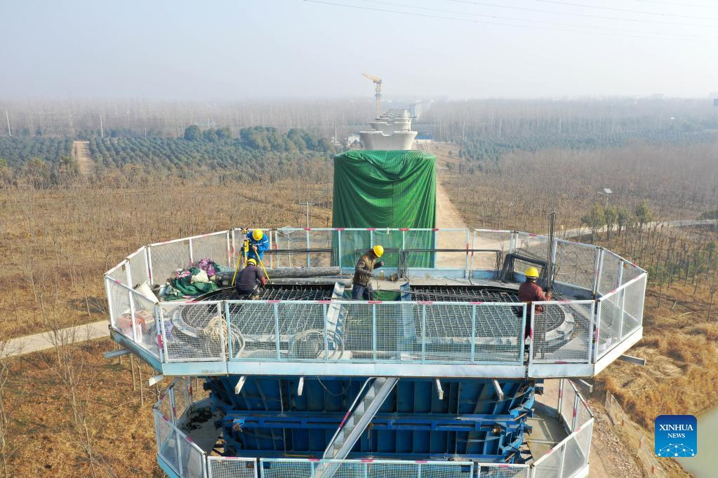 Aerial photo taken on Jan. 3, 2022 shows staff working at the construction site of a grand bridge along the Hefei-Xinyi Railway in Hefei, east China's Anhui Province. Staff of China Tiesiju Civil Engineering Group stick to their positions in construction of Hefei-Xinyi Railway even in the three-day New Year holiday. (Xinhua/Liu Junxi)