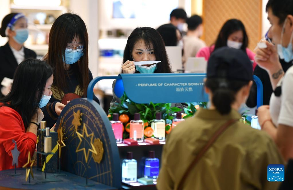 Customers smell perfumes in a duty-free shop in Haikou, capital of south China's Hainan Province, Jan. 3, 2022. (Xinhua/Guo Cheng)