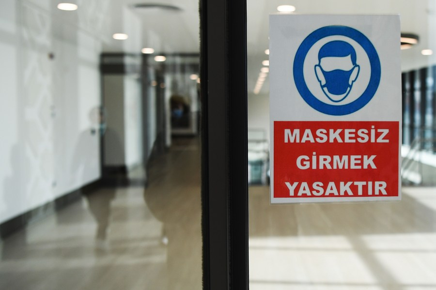 A sign reading "It is forbidden to enter without a mask" is seen on a door at a hospital in Istanbul, Turkey, on Dec 7, 2021. [Photo/Xinhua]