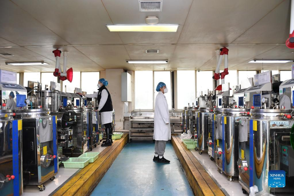 Pharmacists operate machines to make traditional Chinese medicine (TCM) decoctions at Xi'an TCM hospital in Xi'an, northwest China's Shaanxi Province, Jan. 3, 2022. The hospital has been providing TCM decoctions to individuals under medical quarantine and medical workers at the frontline to help control the recent spike in COVID-19 infections in Xi'an. (Xinhua/Li Yibo)