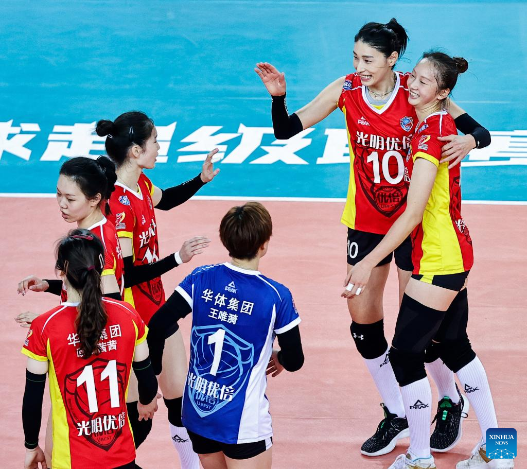 Players of Shanghai celebrate during the second leg of bronze medal match between Shanghai and Liaoning at the 2021-2022 season Chinese Women's Volleyball Super League in Jiangmen, south China's Guangdong Province, Jan. 4, 2022. (Xinhua/Yang Zhisen)