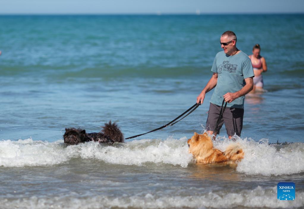 People enjoy their leisure time on the beach in Auckland, New Zealand, Jan. 4, 2022. All New Zealand is sweltered in scorching temperatures as many places in North Island of the country hit record high temperature in the first days of the new year, according to MetService, the national weather broadcast agency here on Wednesday. (Photo by Zhao Gang/Xinhua)