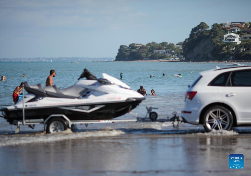 People enjoy their leisure time on the beach in Auckland, New Zealand, Jan. 4, 2022. All New Zealand is sweltered in scorching temperatures as many places in North Island of the country hit record high temperature in the first days of the new year, according to MetService, the national weather broadcast agency here on Wednesday. (Photo by Zhao Gang/Xinhua)