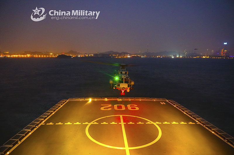 A ship-borne helicopter attached to a brigade under the PLA Navy’s Marine Corps lands on the flight deck of the comprehensive supply ship Dongpinghu (Hull 902) during a night landing operation on December 17, 2021. (eng.chinamil.com.cn/Photo by Cong Lianying)