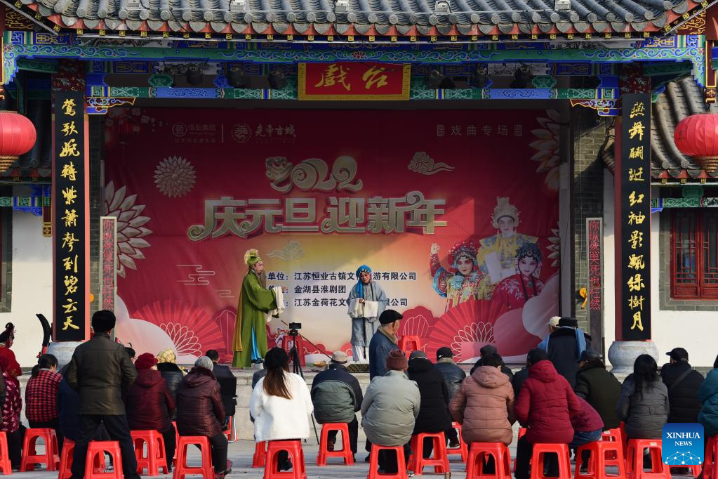 Tourists watch Huai opera, a local opera variety of China's Jiangsu Province, during the New Year holiday in Jinhu County of Huai'an City, east China's Jiangsu Province, Jan. 2, 2022. (Photo by Liang Debin/Xinhua)