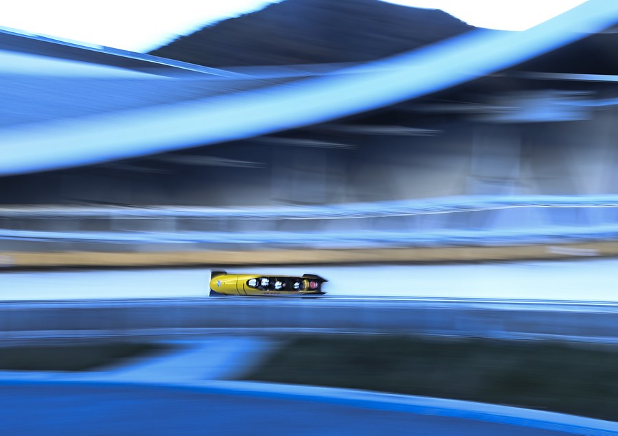 Players of Germany compete during the four-man bobsleigh test event for the Beijing 2022 Olympic Winter Games at the National Sliding Center in Yanqing Zone, Beijing, capital of China, Oct. 26, 2021. (Xinhua/He Changshan)