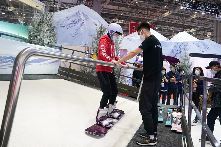 A visitor experiences skiing during the 4th China International Import Expo (CIIE) in east China's Shanghai, Nov. 5, 2021. (Xinhua/Ding Ting)