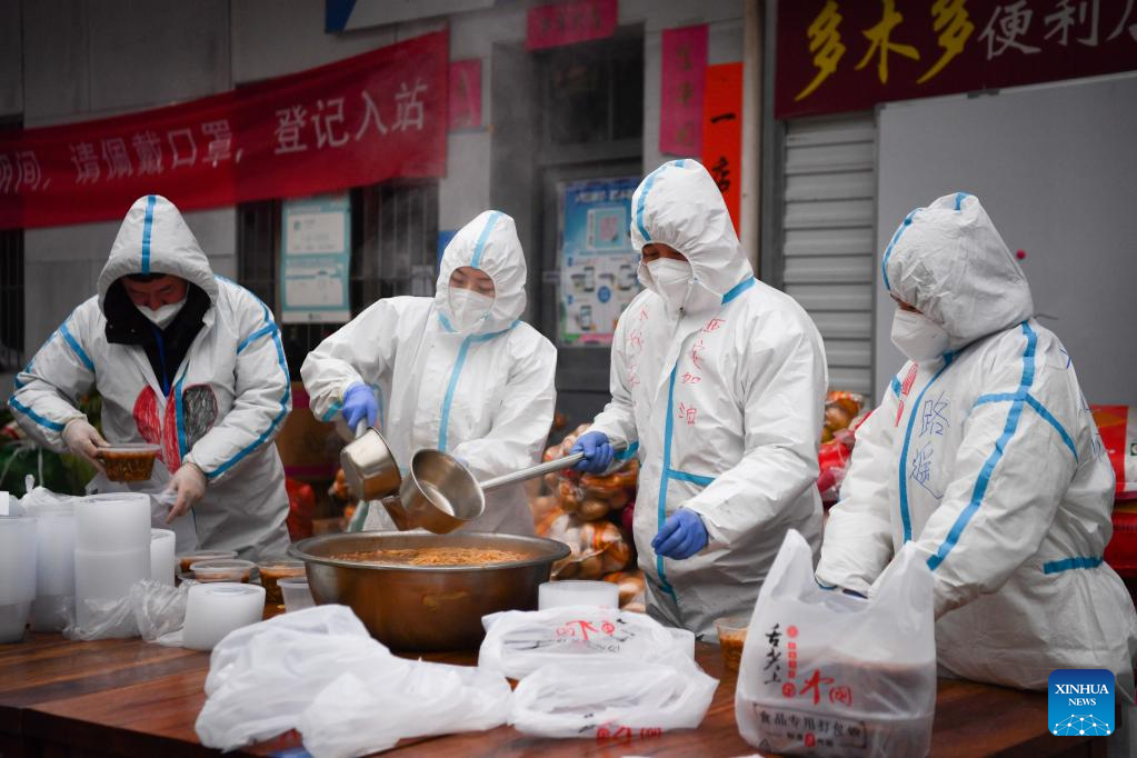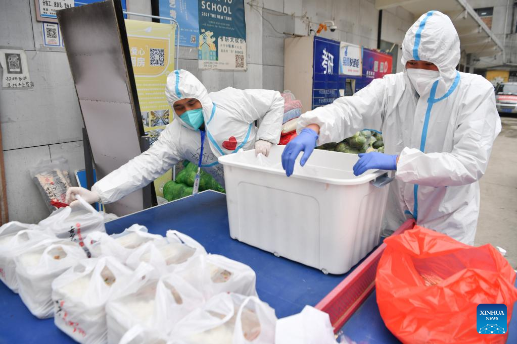 Volunteers package foods for delivery at Deshan shared kitchen in Yanta District of Xi'an, northwest China's Shaanxi Province, Jan. 4, 2022. Located in Yanta District of Xi'an, Deshan shared kitchen was run as an "anti-cancer kitchen", providing convenience for cancer patients and their families to cook meals. Xu Kai, founder of the shared kitchen, transformed this "anti-cancer kitchen" into a "fight-against-epidemic kitchen" after the city has been hit by the recent COVID-19 resurgence. Up to now, more than 30 volunteers have joined the food delivery activities of the kitchen to help not only cancer patients and their families who are stranded in Xi'an, but also some personnel who work for the prevention and control of the COVID-19 epidemic. (Xinhua/Zhang Bowen)