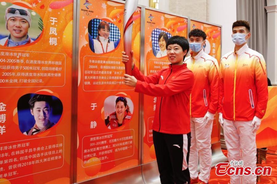 Short track speed skating champion Zhang Hui holds the Olympics torch to the exhibition hall at Harbin, Jan. 5, 2022. (Photo: China News service/Jiang Hui)