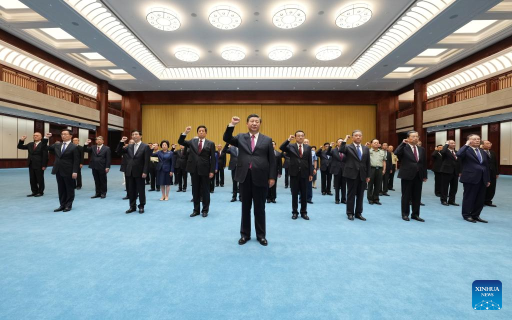 Xi Jinping, general secretary of the Communist Party of China (CPC) Central Committee, Chinese president and chairman of the Central Military Commission, leads other leaders including Li Keqiang, Li Zhanshu, Wang Yang, Wang Huning, Zhao Leji, Han Zheng and Wang Qishan to review the Party admission oath after visiting an exhibition on CPC history themed "staying true to the founding mission" at the Museum of the CPC in Beijing, capital of China, June 18, 2021. (Xinhua/Li Xueren)