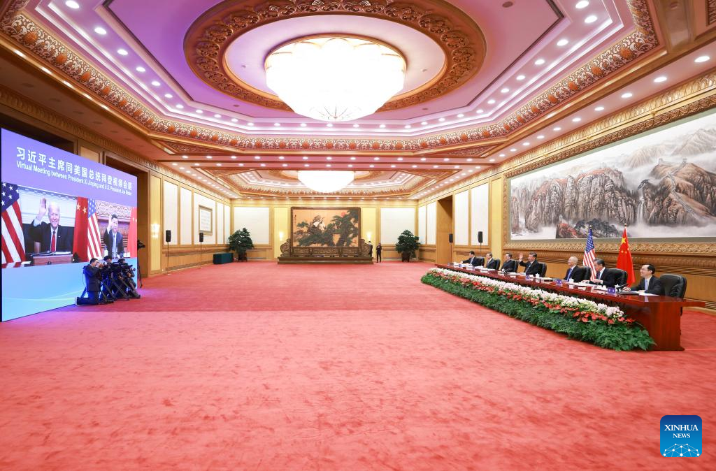 Chinese President Xi Jinping meets with U.S. President Joe Biden via video link, in Beijing, capital of China, Nov. 16, 2021. (Xinhua/Ding Lin)