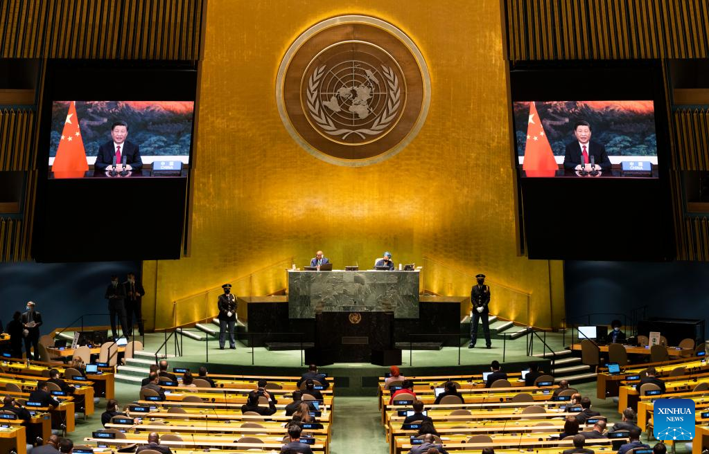 Chinese President Xi Jinping addresses the general debate of the 76th session of the United Nations General Assembly via video on Sept. 21, 2021. (Xinhua/Wang Ying)