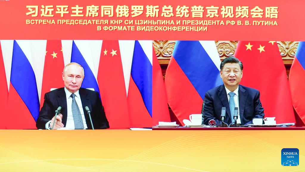 Chinese President Xi Jinping meets with Russian President Vladimir Putin via video link in Beijing, capital of China, Dec. 15, 2021. (Xinhua/Yin Bogu)