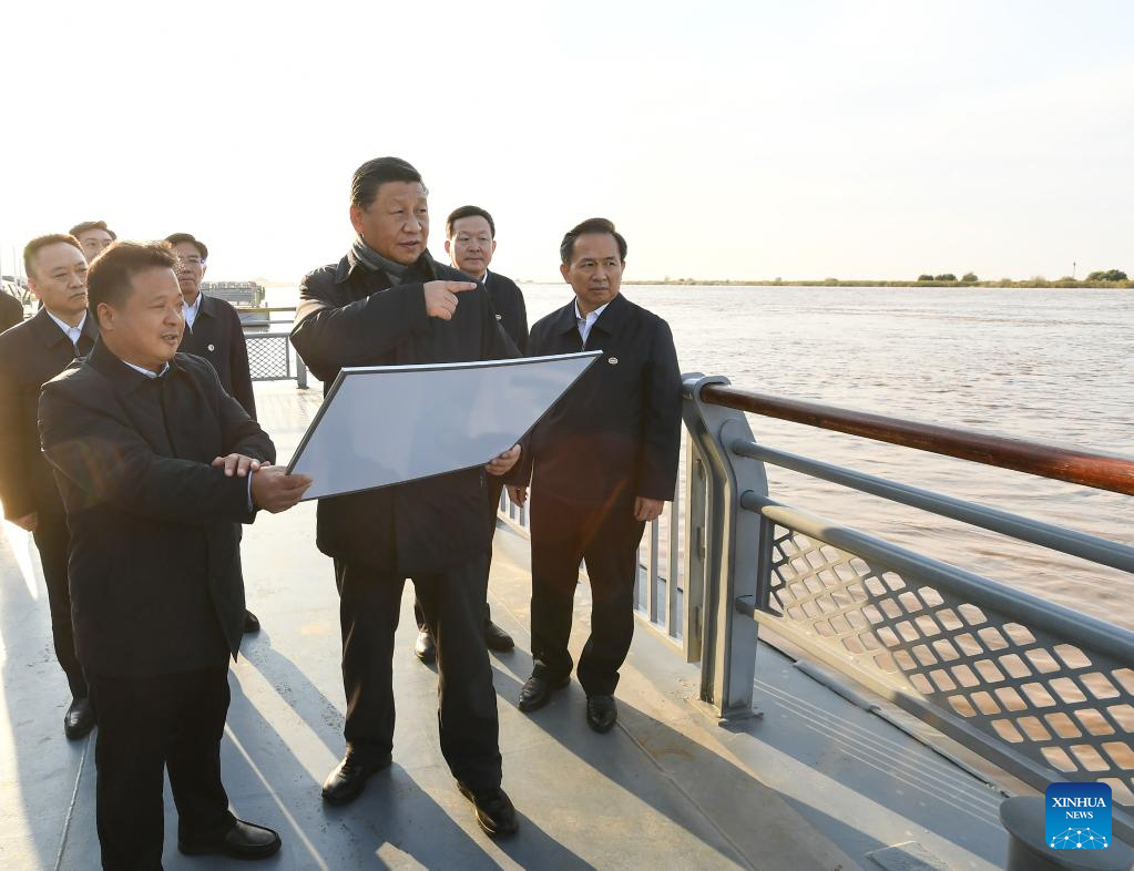 Chinese President Xi Jinping, also general secretary of the Communist Party of China Central Committee and chairman of the Central Military Commission, inspects the estuary of the Yellow River in the city of Dongying, east China's Shandong Province, Oct. 20, 2021. After the visit, Xi chaired a symposium on ecological protection and high-quality development of the Yellow River basin in Jinan, east China's Shandong Province, Oct. 22, 2021. (Xinhua/Xie Huanchi)