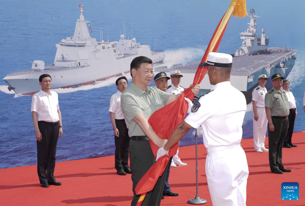 Chinese President Xi Jinping, also general secretary of the Communist Party of China Central Committee and chairman of the Central Military Commission, presents People's Liberation Army (PLA) flag and the naming certificate to the captain and political commissar of the Changzheng-18 in Sanya, south China's Hainan Province, April 23, 2021. Xi attended the commissioning ceremony of three naval vessels, the Changzheng-18, the Dalian, and the Hainan, and boarded the vessels after the ceremony. The vessels were delivered to the PLA Navy and placed in active service on April 23, 2021 at a naval port in Sanya, south China's Hainan Province. (Xinhua/Li Gang)