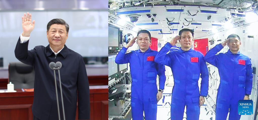 Combo photo shows Chinese President Xi Jinping, also general secretary of the Communist Party of China Central Committee and chairman of the Central Military Commission, holding a conversation at the Beijing Aerospace Control Center (L) with three astronauts Nie Haisheng, Liu Boming and Tang Hongbo stationed in the country's space station core module Tianhe (R), on June 23, 2021. (Xinhua/Ju Peng, Yue Yuewei)