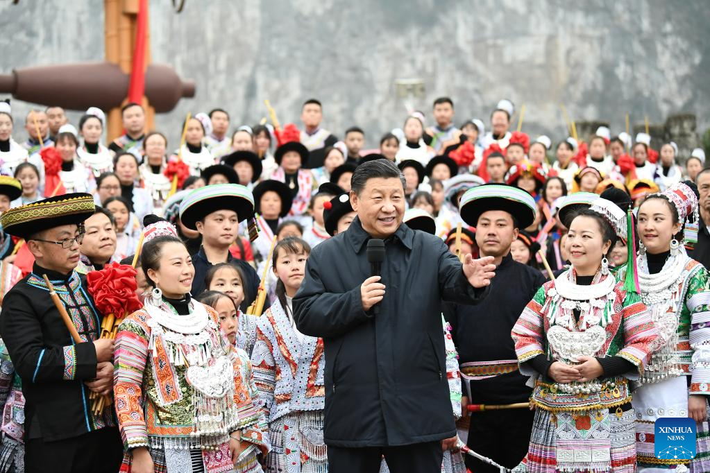 Chinese President Xi Jinping, also general secretary of the Communist Party of China Central Committee and chairman of the Central Military Commission, talks to villagers who are participating in festive activities, and extends his New Year's greetings to people of all ethnic groups across the country, on a public square of Huawu Village, Xinren Miao Township of Qianxi County, Bijie, southwest China's Guizhou Province, Feb. 3, 2021. Xi inspected Guizhou Province ahead of the Spring Festival, or the Chinese Lunar New Year, from Feb. 3 to 5, 2021. (Xinhua/Xie Huanchi)