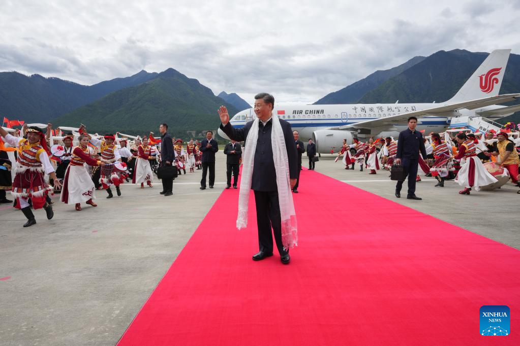 Xi Jinping, general secretary of the Communist Party of China Central Committee, Chinese president and chairman of the Central Military Commission, arrives at the Nyingchi Mainling Airport and is warmly welcomed by local people and officials of various ethnic groups in southwest China's Tibet Autonomous Region, July 21, 2021. Xi visited the Tibet Autonomous Region from July 21 to 23, 2021. He extended congratulations to the 70th anniversary of Tibet's peaceful liberation and visited officials and ordinary people of various ethnic groups. (Xinhua/Li Xueren)