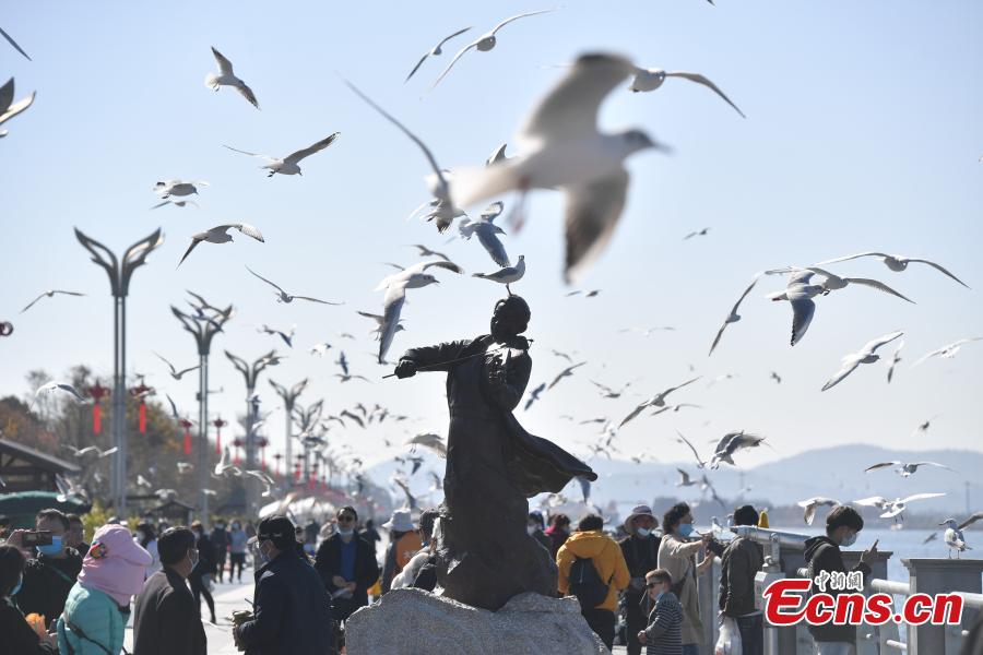 The migratory red-billed gulls are widely seen in southeast China's coastal regions and migrate to Kunming for hibernation in winter days.