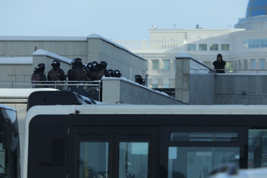 Military personnel patrol in front of the presidential palace in Nur-Sultan, Kazakhstan, Jan. 6, 2022. (Photo by Kalizhan Ospanov/Xinhua)