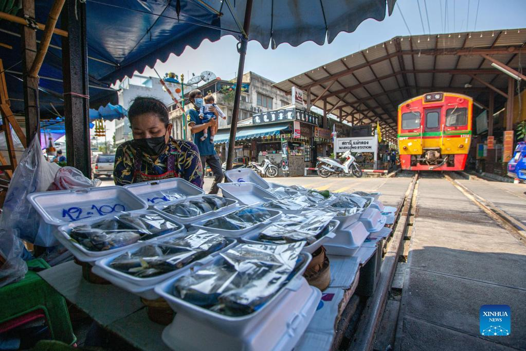 A vendor is seen at Maeklong Railway Market in Samut Songkhram Province, Thailand, Jan. 5, 2022. In Maeklong Railway Market, built along a railway track, a compromise is reached between vendors and passing commuter trains. When the rail track is clear, stall owners can set up stalls at will. Before the COVID-19 pandemic, the market had attracted many tourists. Nowadays, due to the decrease of passengers, the number of trains that shuttle here every day has been reduced from eight to two. (Xinhua/Wang Teng)