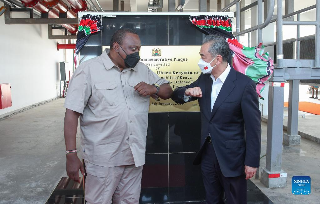 Kenyan President Uhuru Kenyatta (L) and Chinese State Councilor and Foreign Minister Wang Yi attend the completion ceremony of the Chinese-built oil terminal at the port of Mombasa in Mombasa, Kenya, on Jan. 6, 2022. (Xinhua/Long Lei)