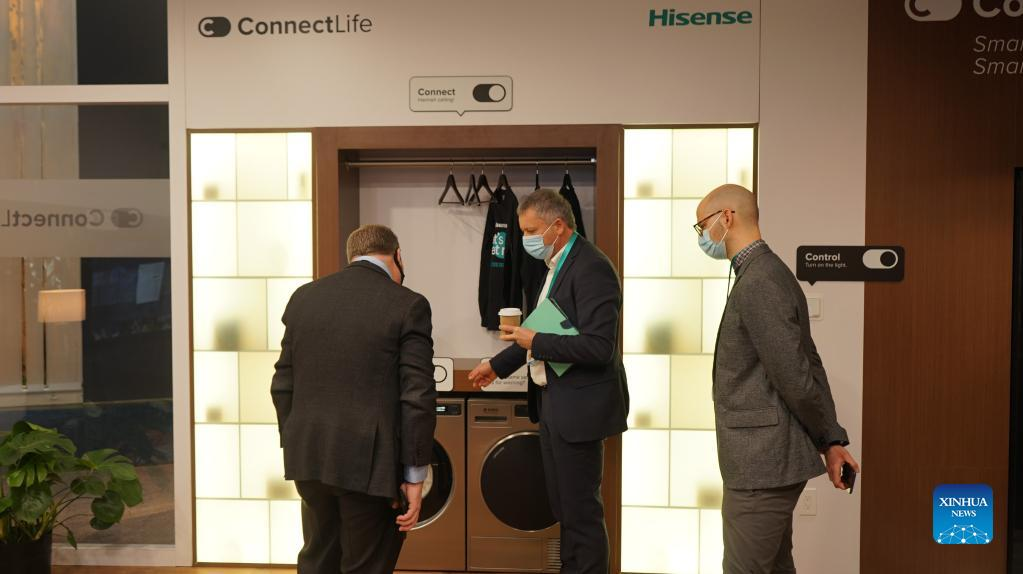 A visitor views intelligent home appliances at the exhibition area of Hisense, a Chinese consumer electronics and appliance manufacturer, during the 2022 Consumer Electronics Show (CES) in Las Vegas, the United States, Jan. 5, 2022. The 2022 CES, scheduled from Jan. 5 to 7, drew more than 2,300 exhibitors, including 800 startups, as well as hundreds of thought leaders. (Photo by Zeng Hui/Xinhua)