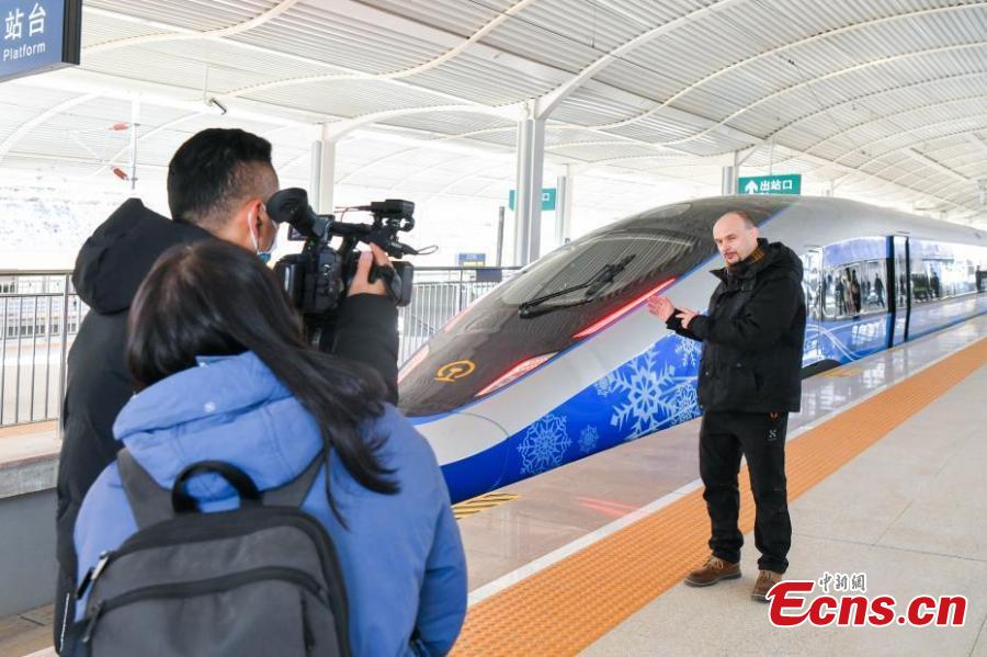 A foreign correspondent reports by a smart Fuxing train at Taizicheng Railway Station, Jan. 6, 2022. (Photo: China News Service/Sun Lijun)